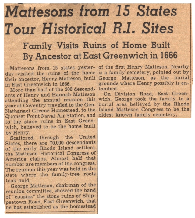 I also have an undated newspaper clipping which describes how "George Matteson, chairman of the reunion comittee, showed the band of "cousins" the stone ruins of Shippeetown Road, East Greenwich that he has established as the homestead of the first Henry Matteson." and "Nearby is a family cemetery, pointed out by George Matteson as the burial grounds where Henry possibly is buried."2