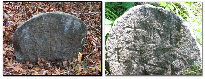 The letters J, U, and W of the modern alphabet were not fully adopted until mid-18th century. In their place the letter I was used for J, V for U, and double interlocking Vs were used as a W. The letter I with a bar through it used in place of the letter J and the letter V used instead of a U can be found throughout the cemetery. Double interlocking Vs can also be found in place of the modern W. Below are some examples of these early stones.